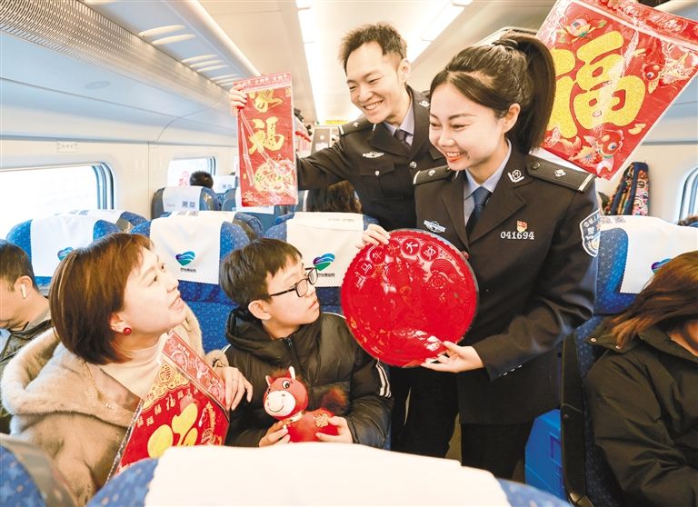 2月2日,包頭鐵路公安處民警在列車上與乘客進行安全出行知識問答。當日是春運首日,包頭鐵路公安處組織“平安春運路 鐵警文化行”文藝宣傳活動,通過文藝表演、知識問答等形式向旅客宣講安全出行注意事項、反詐知識等內(nèi)容,讓旅客在返鄉(xiāng)途中感受平安與溫暖。草原云·正北方網(wǎng)記者 孟和朝魯 攝